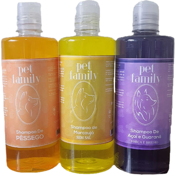 - FRUTAS TROPICAIS - Shampoo de Maracujá + Açaí com Guaraná + Pêssego - Com 3 Unid. Pet Family 500 ml